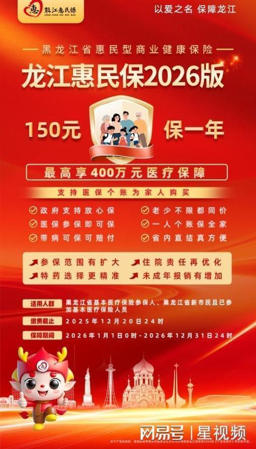 “龍江惠民保2026版”參保通道僅剩最后五天,將于2025年12月20日24時正式關閉。凡黑龍江省基本醫(yī)保參保人,只需通過“龍江惠民保”微信公眾號即可參保,每人每年150元,最高享400萬元醫(yī)療保障。