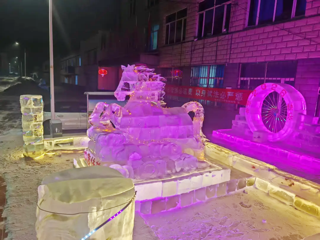 活動(dòng)現(xiàn)場(chǎng),專業(yè)技術(shù)工人憑借精湛技藝,專注勾勒駿馬整體輪廓,對(duì)眼部、鬃毛等關(guān)鍵部位精雕細(xì)琢,力求每一處細(xì)節(jié)都精準(zhǔn)靈動(dòng);林場(chǎng)干部職工則主動(dòng)扛起取冰、補(bǔ)冰、轉(zhuǎn)運(yùn)等“硬核”任務(wù),大家分工明確、默契配合,叮叮當(dāng)當(dāng)?shù)墓ぞ咔脫袈?、此起彼伏的互助吆喝聲,交織成冬日里最熱鬧的樂章。經(jīng)過十余天的奮戰(zhàn),一尊尊栩栩如生的冰雕驚艷亮相,并成為林場(chǎng)及周邊區(qū)域的“新春網(wǎng)紅地標(biāo)”,不少職工家屬、周邊群眾紛紛慕名而來,拍照打卡、定格年味瞬間,歡聲笑語為林場(chǎng)增添了更多溫馨氛圍。