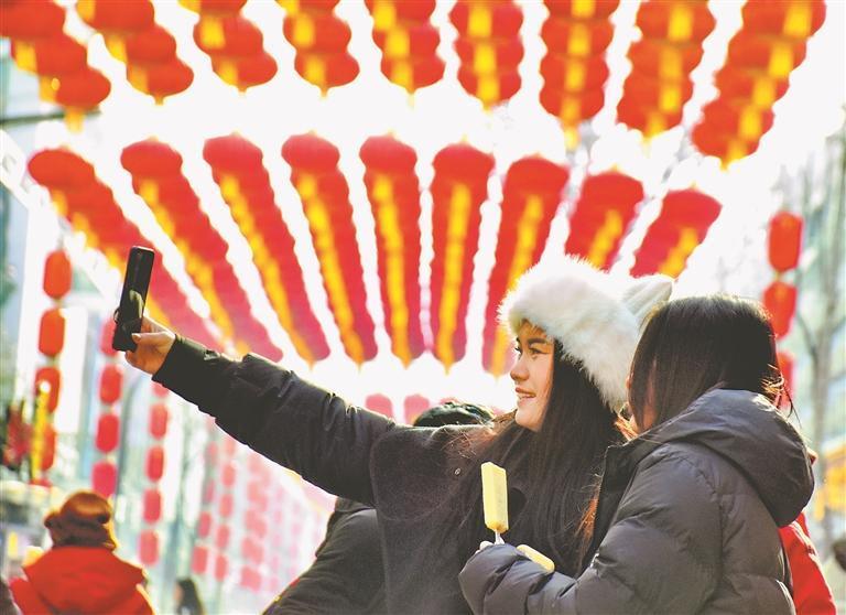 2月10日,北方小年,為迎接新春佳節(jié)的到來,哈爾濱市道外區(qū)南三道街懸掛了近千盞紅燈籠,喜慶氣氛濃厚。在一排排大紅燈籠下面,有的游客在拍照,有的游客在觀賞風(fēng)景。